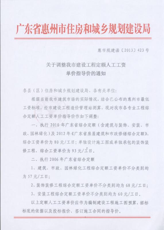 關(guān)于調(diào)整我市建設(shè)工程定額人工工資單價指導(dǎo)價的通知(惠市規(guī)建函〔2013〕423號)