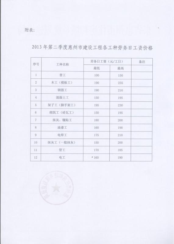 關(guān)于發(fā)布惠州市建設(shè)工程勞務(wù)工資單價(jià)的通知(惠市規(guī)建函〔2013422號(hào))