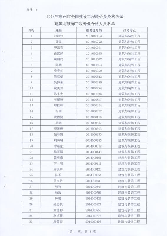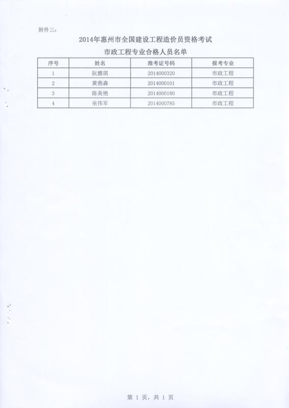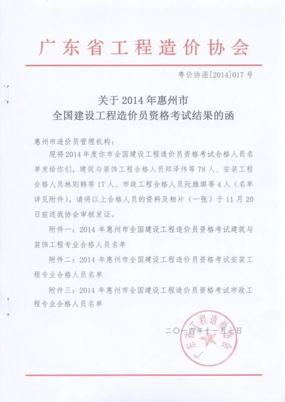 關(guān)于2014年惠州市全國建設(shè)工程造價(jià)員資格考試結(jié)果的函