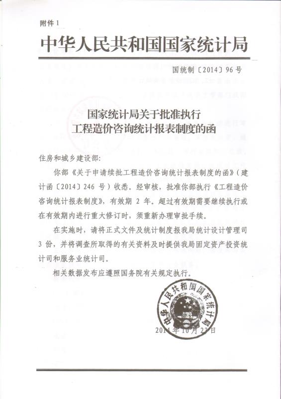 附件:1.國家統(tǒng)計局關(guān)于批準(zhǔn)執(zhí)行工程造價咨詢統(tǒng)計報表制度的函(國統(tǒng)制[2014]96號)