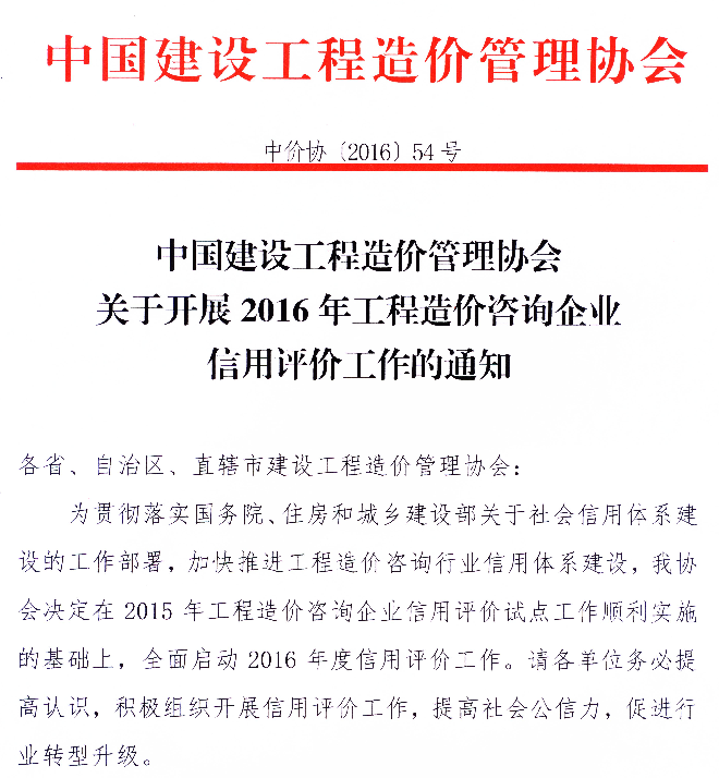 中價(jià)協(xié)關(guān)于開展2016年工程造價(jià)咨詢企業(yè)信用評(píng)價(jià)工作的通知